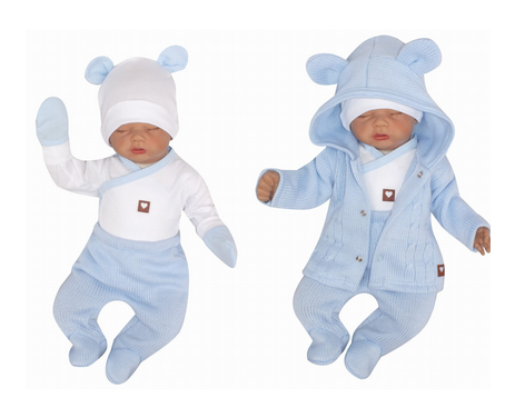 Materiál: body, čepička a rukavičky - 100% bavlna, polodupačky a svetřík - 100% Akryl.