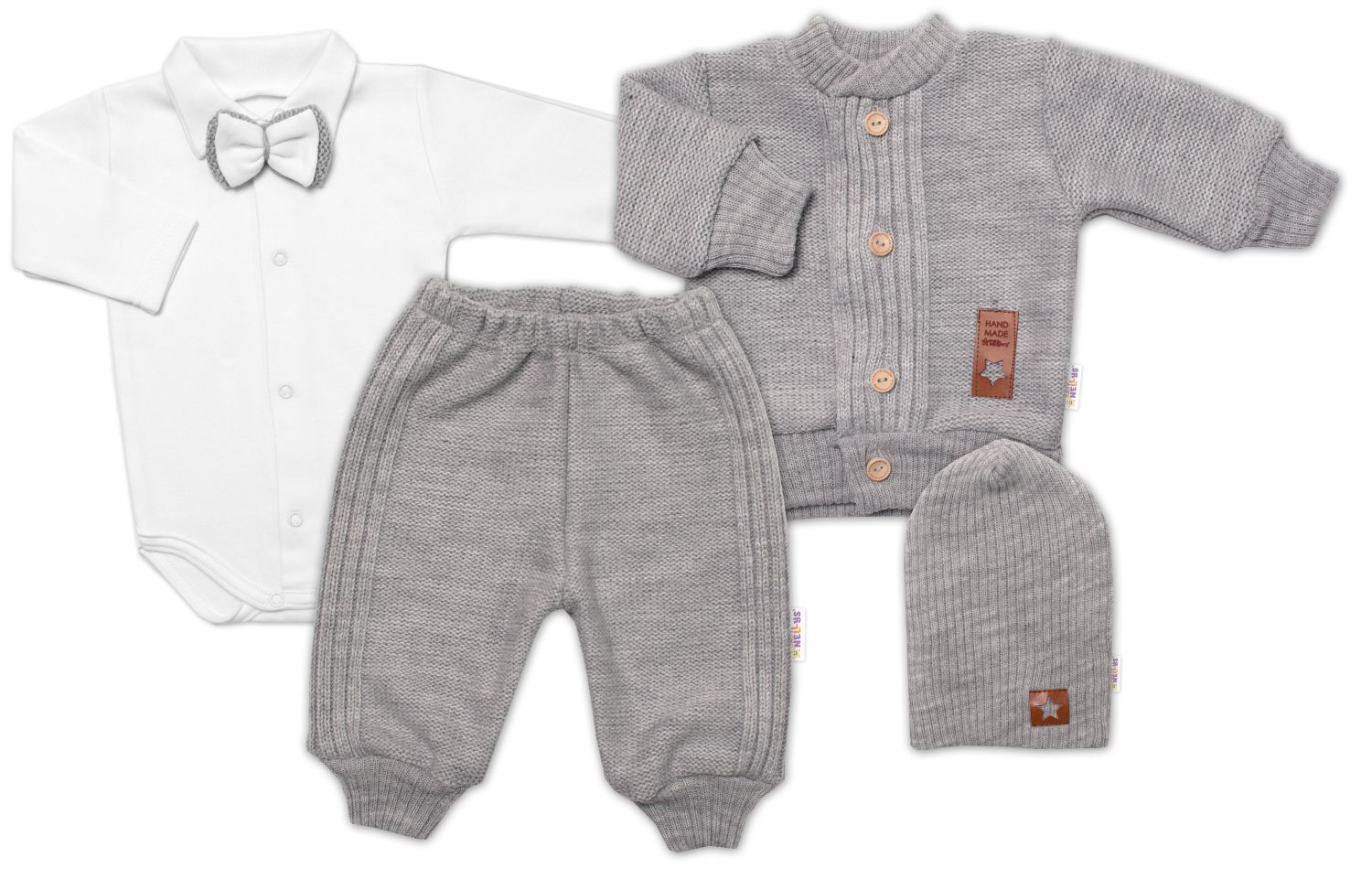 5-dílná pletená sada Baby Nellys, Boy, body, kalhoty, svetr, čepička, motýlek - šedá, 68Doručení do (dny):61 136 Kč/ ks