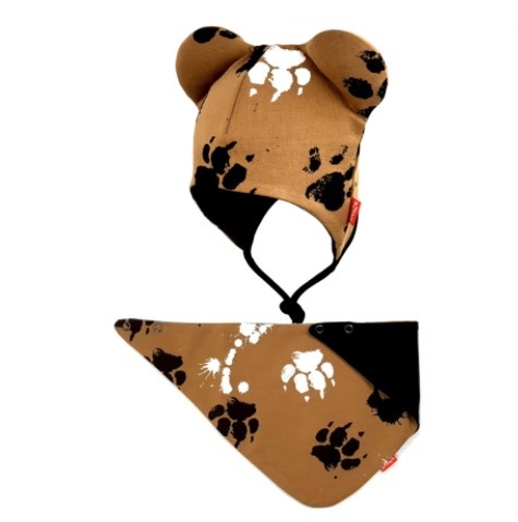 - Bexa dvouvrstvá čepice na zavazování s oušky + šátek - Tlapky, hnědá, vel. 80/92