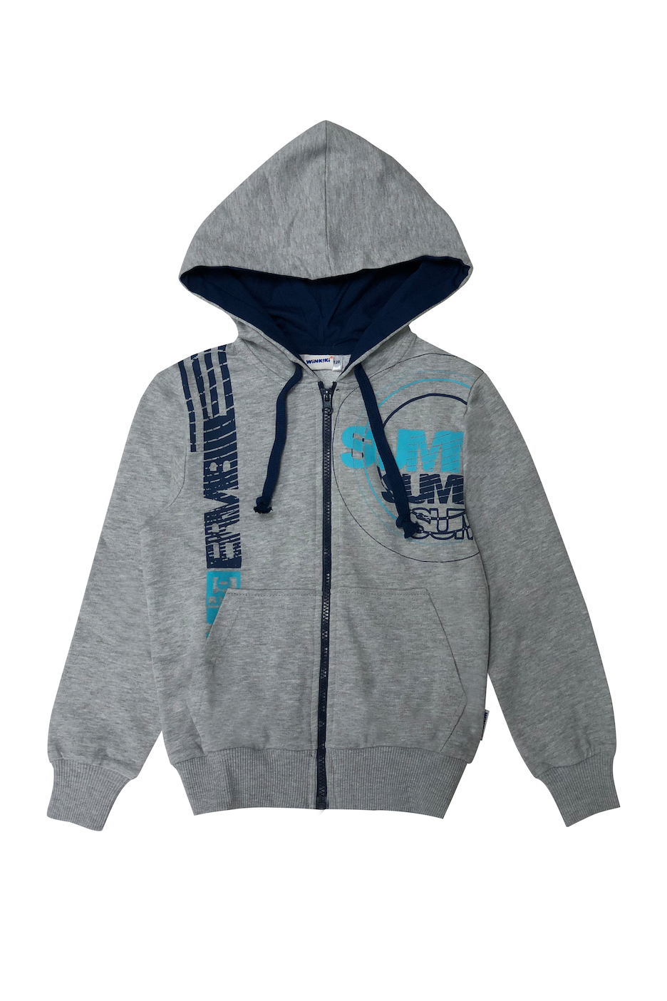 Chlapecká mikina v tyrkysové barvě. Kapuce, elastické konce rukávů a elestický lem v pase jsou v tmavě modré barvě NAVY. Kapuce je na zavazování. Zepředu velká dvojitá kapsa a na prsou velké W. Příjemný a teplý materiál - 100% bavlna. Velik