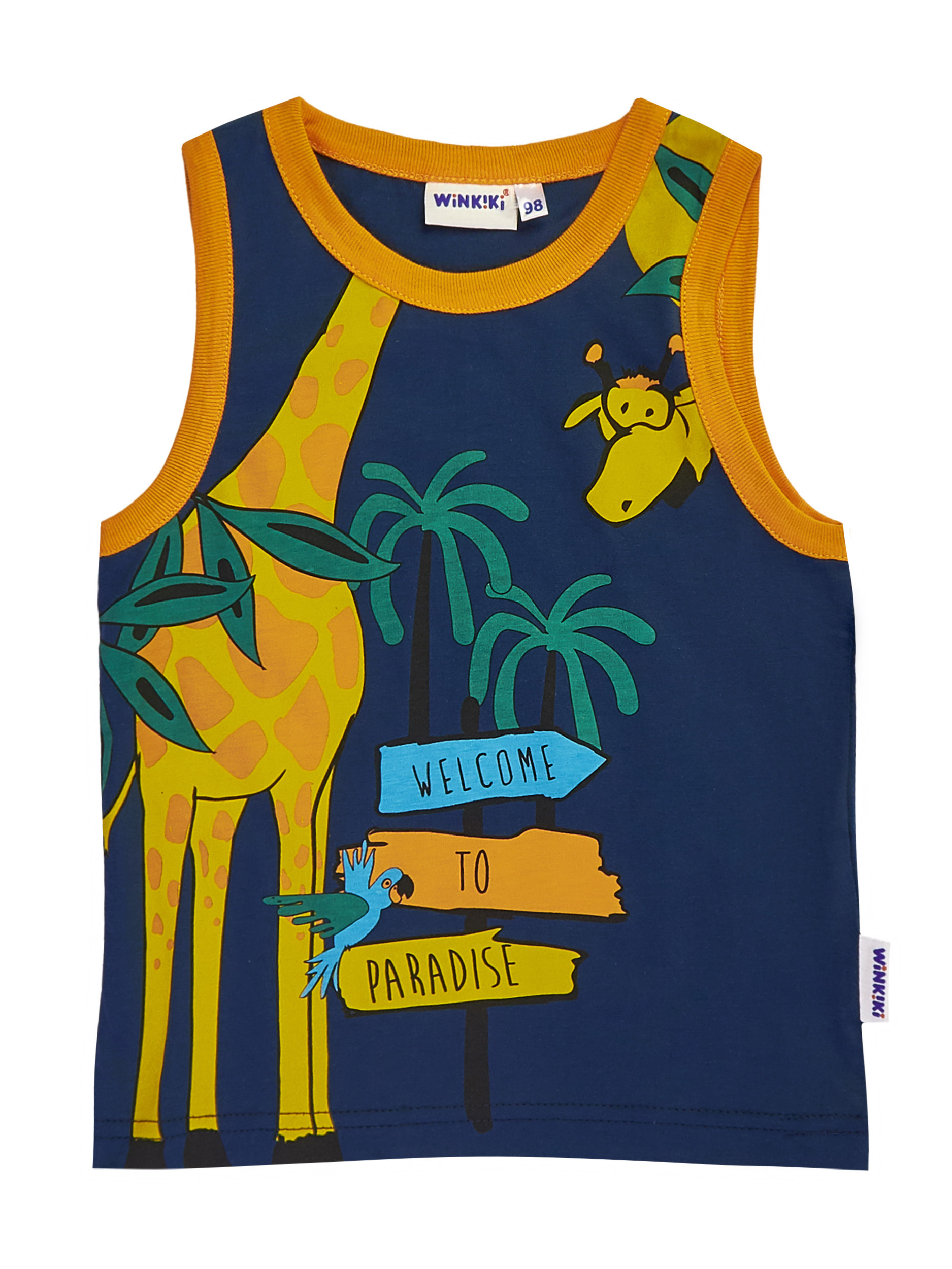 Chlapecké tílko Paradise v tmavě modré barvě NAVY. Pocit léta se přímo nabízí. Kvalitní 100% bavlna. Velikosti 98 - 122. Vyrobeno v Uzbekistánu. Materiál: 100% bavlna. Látka: Supreme 150-160 gr. Návod k údržbě: Při praní se vždy řiďte pokyny uvedenými na štítku! Dostupné velikosti: 98 - 122. Barva: navy.