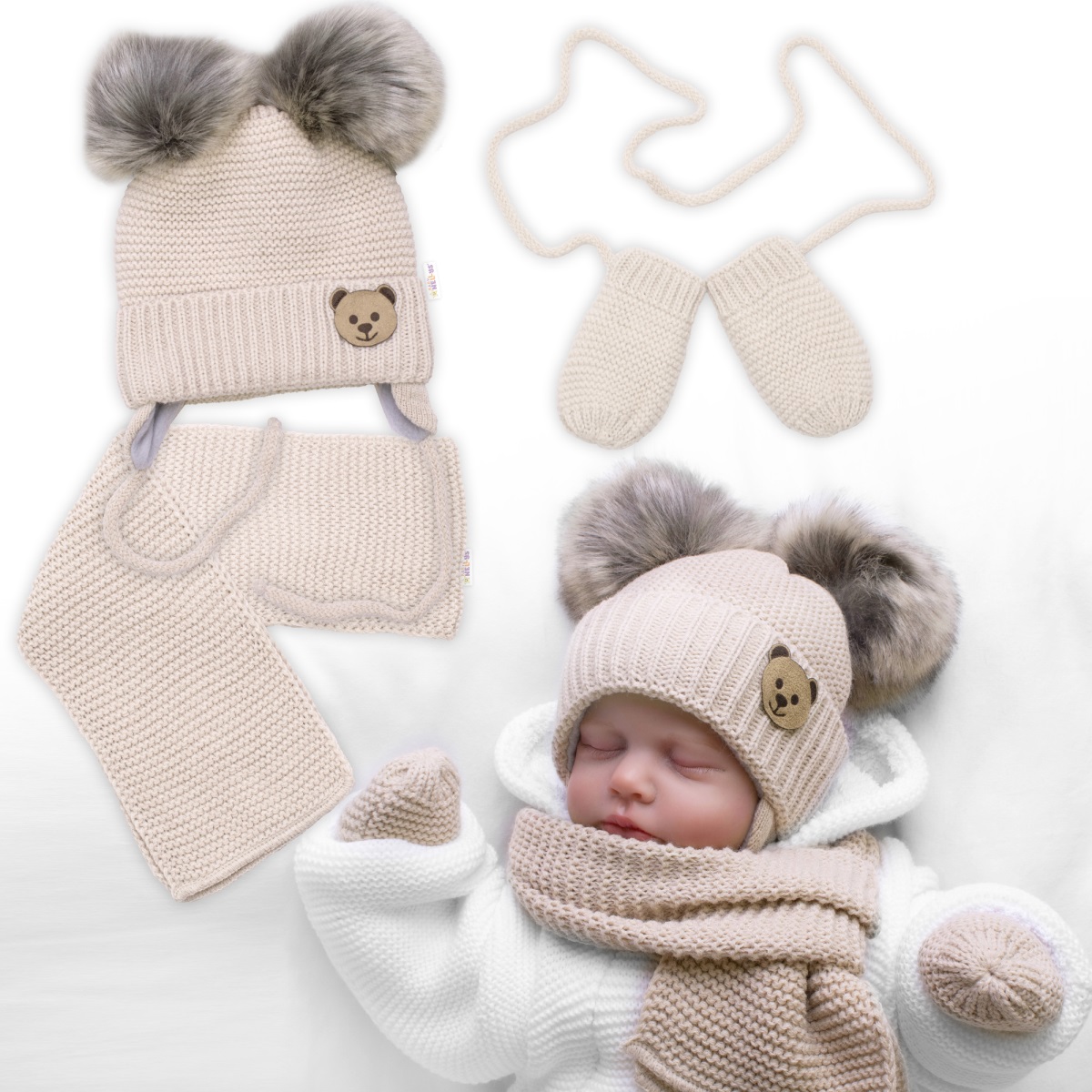 - Dětská sada, zimní čepice s šálou + rukavičky 3D, Teddy Bear - béžová