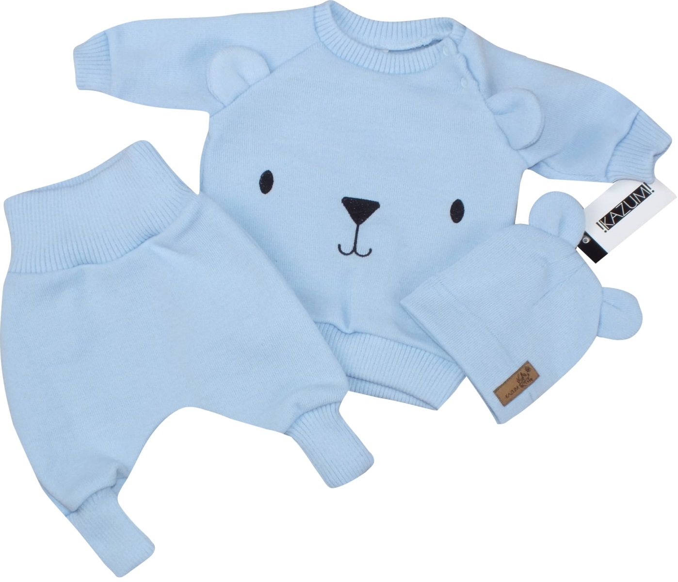 - Pletená kojenecká sada 3D Medvídek, svetřík, tepláčky + čepička Kazum, modrá, vel. 68