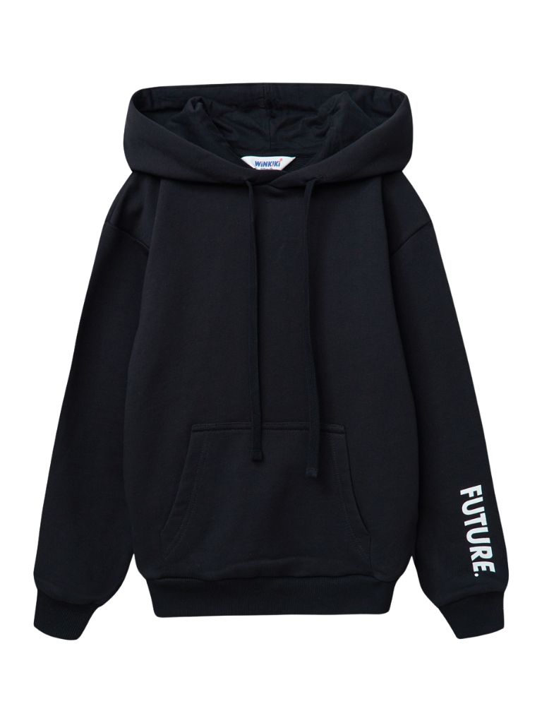 Unisex mikina s kapucí Future v barvě černá. Ideální do podzimních měsíců. Zahřeje a potěší. Vyrobeno v Uzbekistánu z přírodního materiálu 100% bavlna. Látka je nečesaná teplákovina. Ve velikostech 122 - 170.